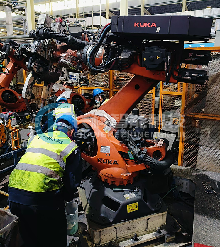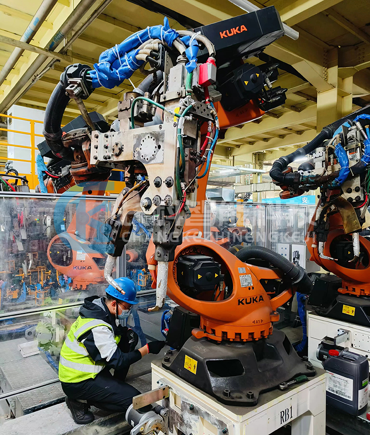 The maintenance of the KUKA robot this time is all carried out in the welding department. The production line includes air outer panel assembly, front floor beam assembly, right front longitudinal beam assembly, left front longitudinal beam assembly, left fender process parts, right wheel cover inner panel, right wheel cover outer panel, front wall panel, rear wall panel