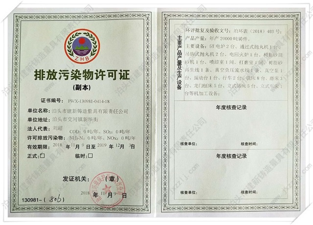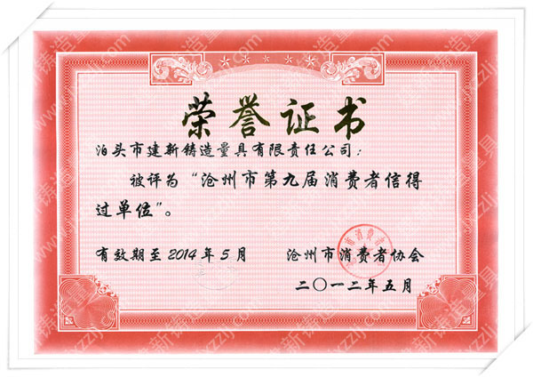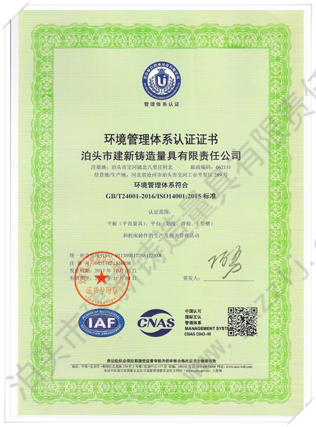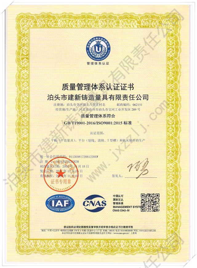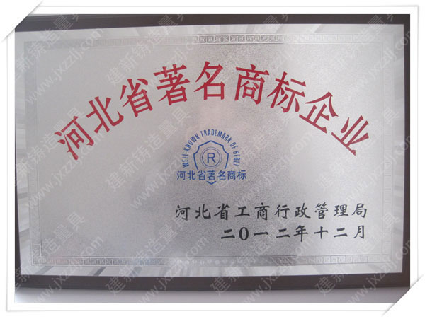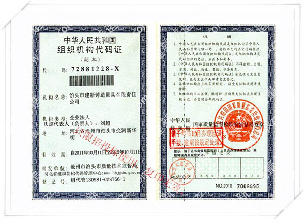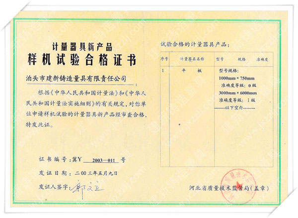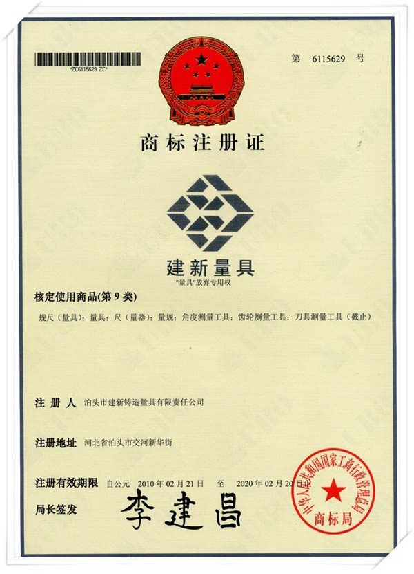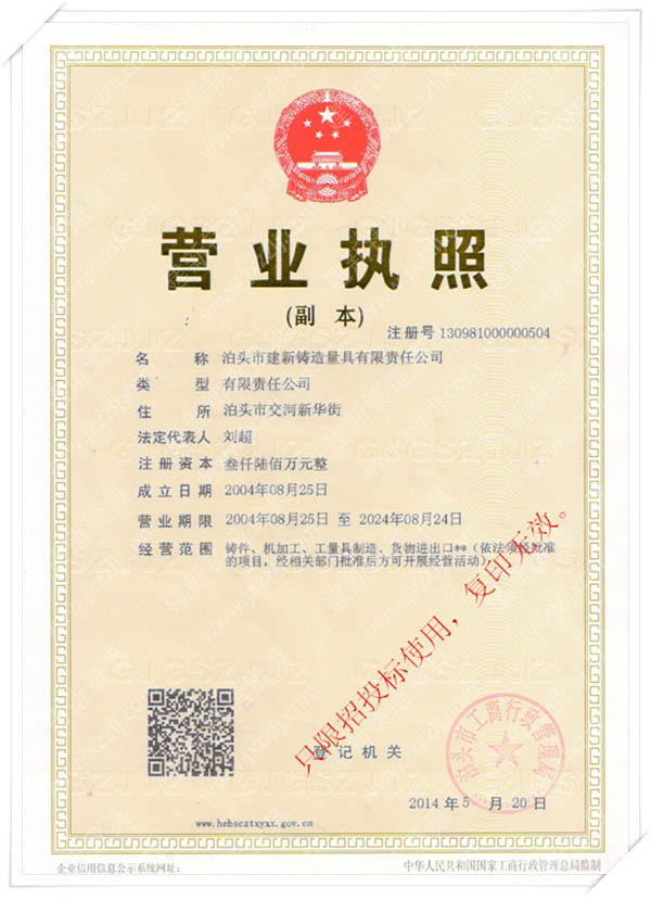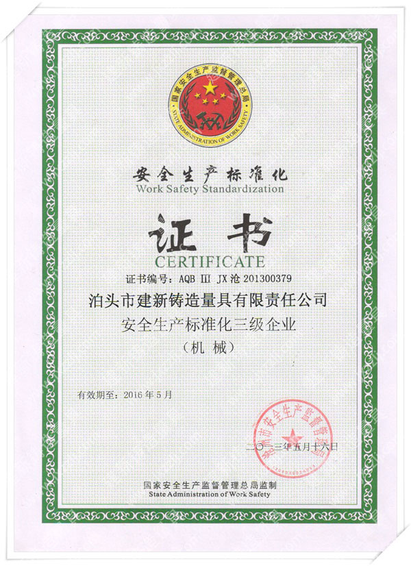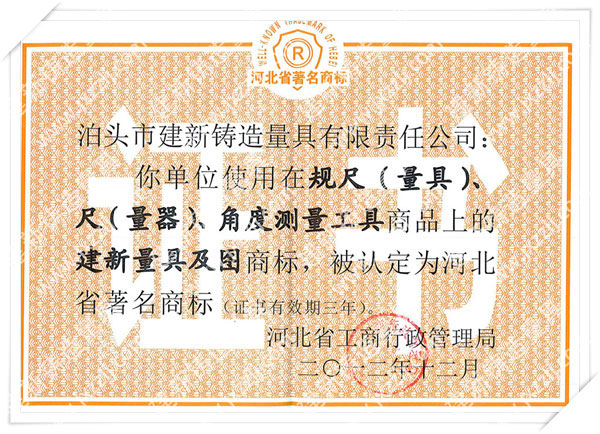 泊頭市建新鑄造量具有限責任公司是河北省固定資產重點投資項目技術企業。取得“建新量具-商標注冊證”“河北省名牌產品”、“河北省著名商標”、中國鑄造協會常任理事單位“機械工業質量管理獎”、“滄州市第九屆消費者信得過單位”、“中國人民銀行機構信用代碼證”“、計量器具新產品樣機試驗合格證書“全國安全生產三級認證企業”等榮譽稱號。